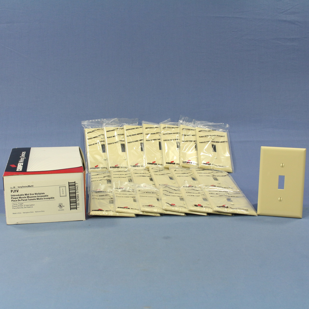 20 Cooper PJ1V ivory unbreakable switch cover wallplates. Commercial Specification Grade, Mid-Size, made of a high-performance unbreakable thermoplastic for high abuse environments; do not confuse it with regular residential grade wallplates which can chip and crack. Mid-Size size measures 3.125"w X 4.875"h, 3/8" larger in both dimensions than standard size plates and is intended for use with larger volume outlet boxes or to hide irregularities in the surrounding wall. Features include: