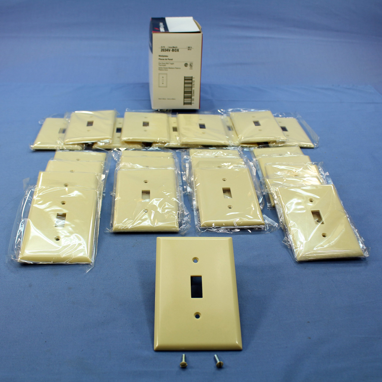 25 Cooper Wiring Devices 2034V ivory single-gang toggle switch Mid-Size wallplates. This larger size plate measures 4.875"h x 3.125"w, 3/8" higher and wider than standard size wallplates to cover large wallbox openings and hide wall irregularities. Non-flammable thermoset plates provide flush-fitting, warp-resistant performance. Includes matching mounting screws.