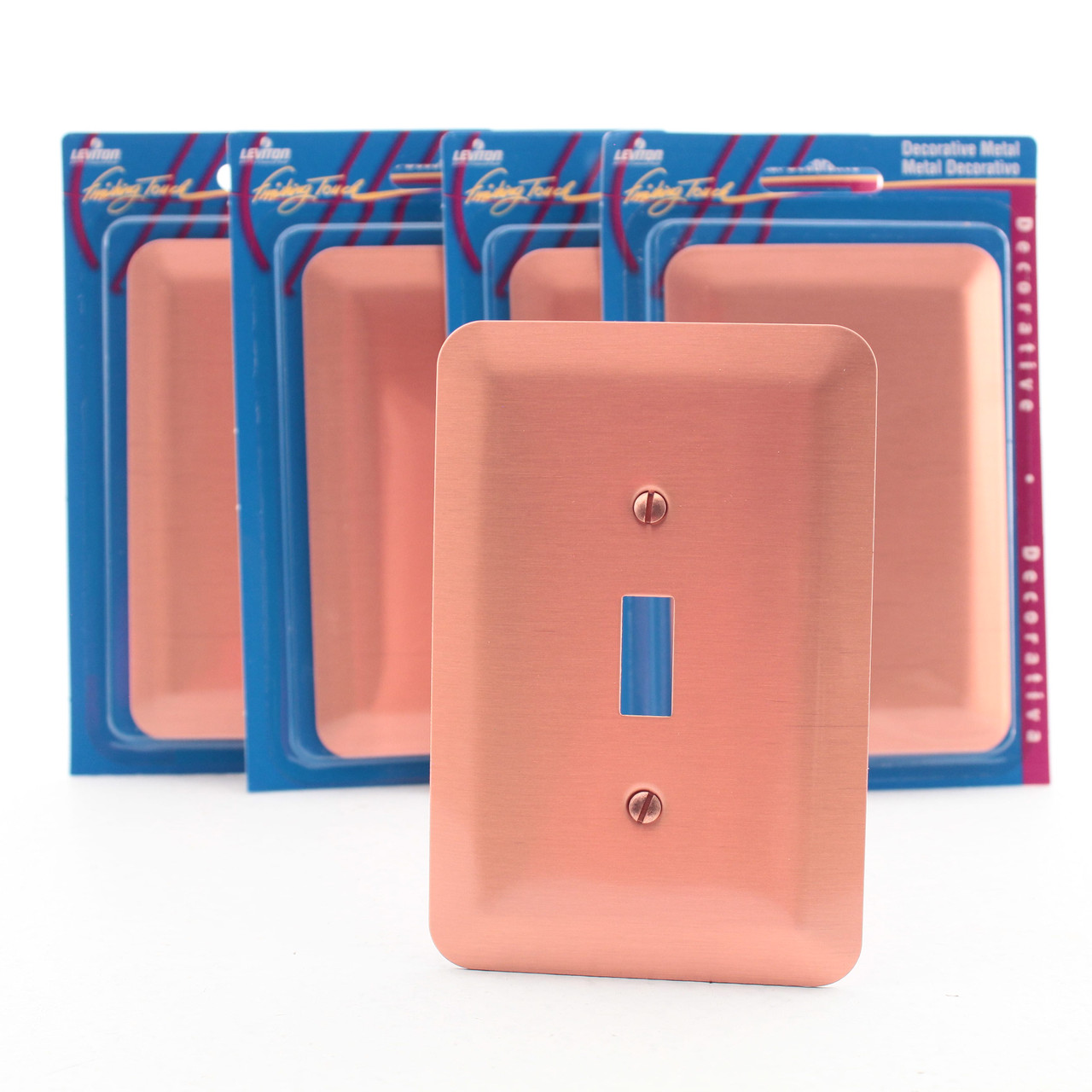 5 Leviton 89301-COP copper-finished metal switch covers. Residential Grade, single-gang wallplate with toggle switch opening. Oversized dimensions measure 5.25"h x 3.25"w, 3/4" higher and wider than conventional wallplates to provide maximum coverage of large box cutouts and wall irregularities. Brushed copper finish has horizontal orientation. Features include: