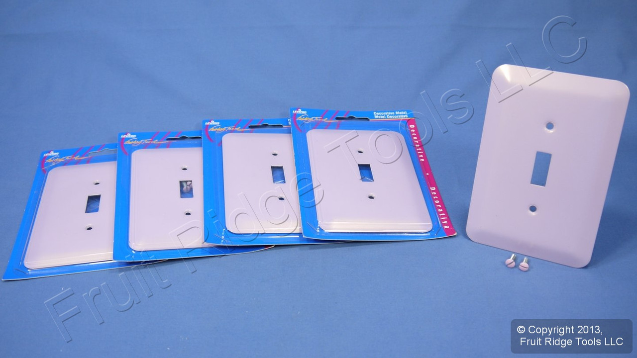 5 Leviton 89301-PNK pink metal switch covers with a pink rose motif. Residential Grade, single-gang wallplate with toggle switch opening. Oversized dimensions measure 5.25"h x 3.25"w, 3/4" higher and wider than conventional wallplates to provide maximum coverage of large box cutouts and wall irregularities. Features include: