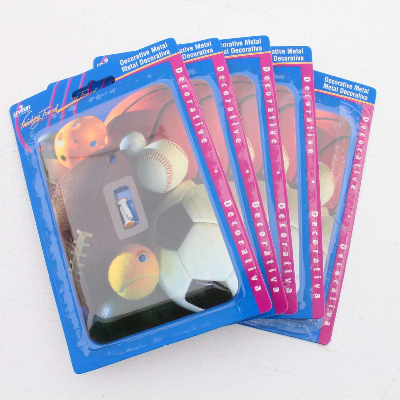 5 Leviton 89001-SPT sports theme painted metal wallplates. Special oversize dimensions, measuring 5.25"h x 3.50"w, 3/4" higher and wider than conventional wallplates to provide maximum coverage of wall irregularities. Features include:
