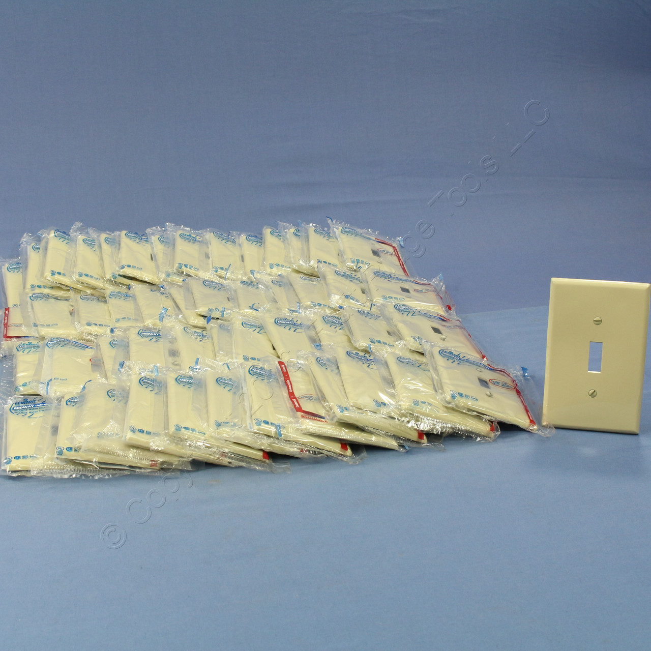 50 Leviton PJ1-I ivory switch cover wallplates. Commercial Grade, Midway size, made of a high-performance unbreakable thermoplastic for high abuse environments; do not confuse it with regular residential grade wallplates which can chip and crack. Midway size measures 3.125"w X 4.875"h, 3/8" larger in both dimensions than standard size plates and is intended for use with larger volume outlet boxes or to hide irregularities in the surrounding wall. Features include: