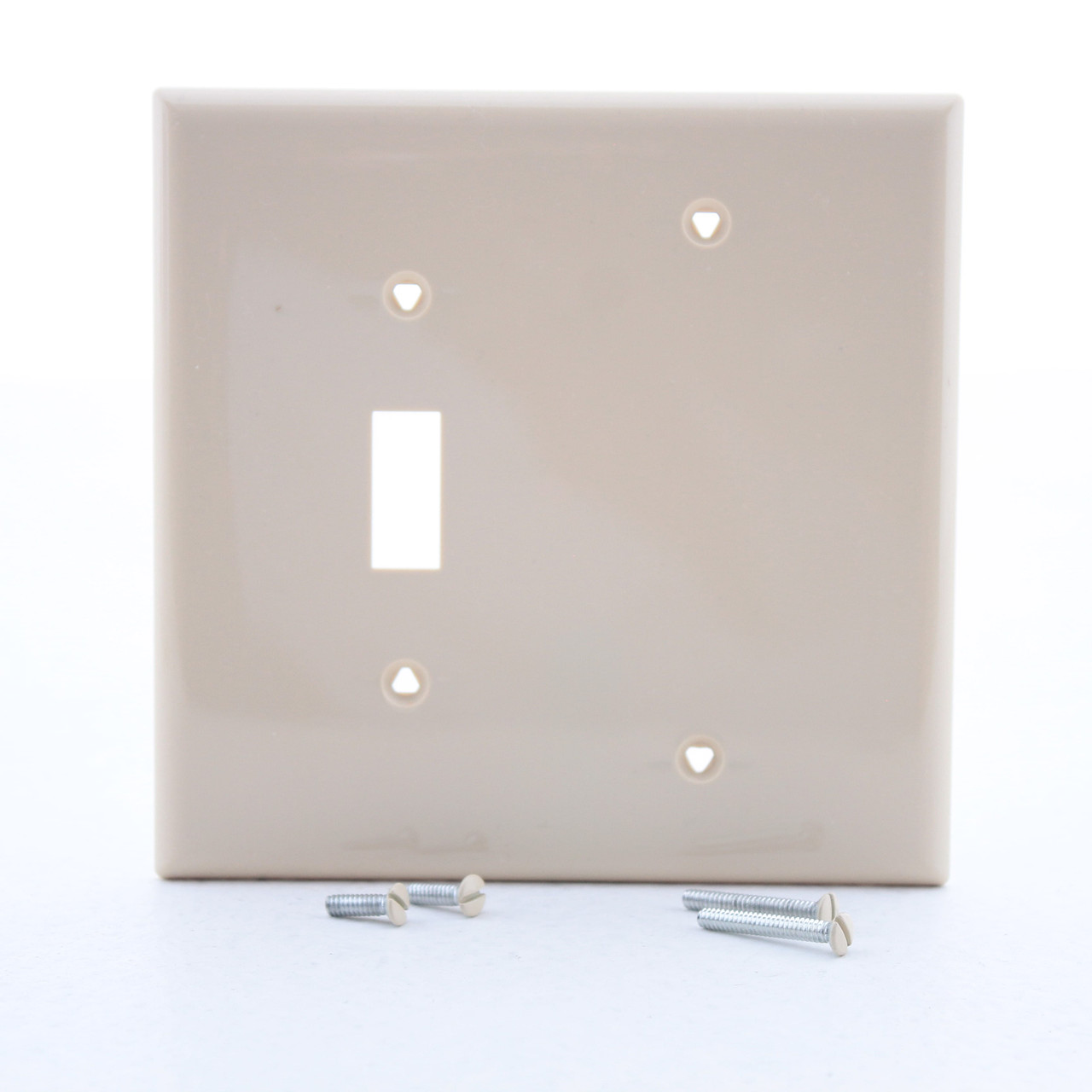 Cooper PJ113V ivory wallplate. Commercial Specification Grade with one toggle switch opening and one blank box-mount space. Good for custom applications or to cover a vacant space when a fixture has been removed from a 2-gang box. Mid-Size, measuring 4.875"h x 4.938"w, 3/8" higher and wider than standard wallplates for use with larger size wall boxes and to hide irregularities on the surrounding wall. Features include: