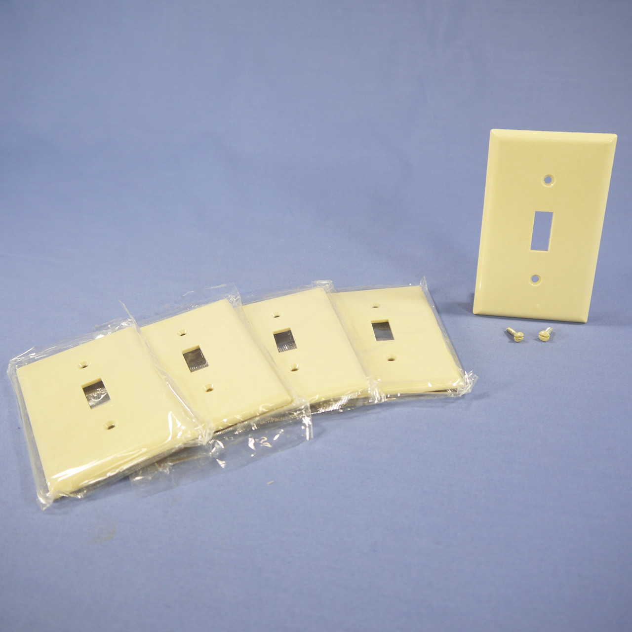 5 Eagle 2134V ivory single-gang toggle switch thermoset wallplates (manufactured by Eagle, a division of Cooper Wiring). Standard grade, standard single gang size, measuring 4.5"h x 2.75"w with one toggle switch opening. Fits standard straight blade single outlets. Features include: