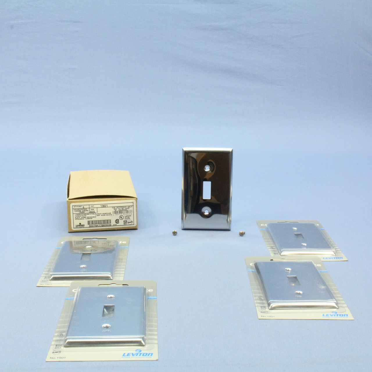 5 Leviton 1901 chrome-plated toggle switch wallplates. Commercial Grade, standard size single-gang cover, measuring 4.5"h x 2.75"w. Features include: