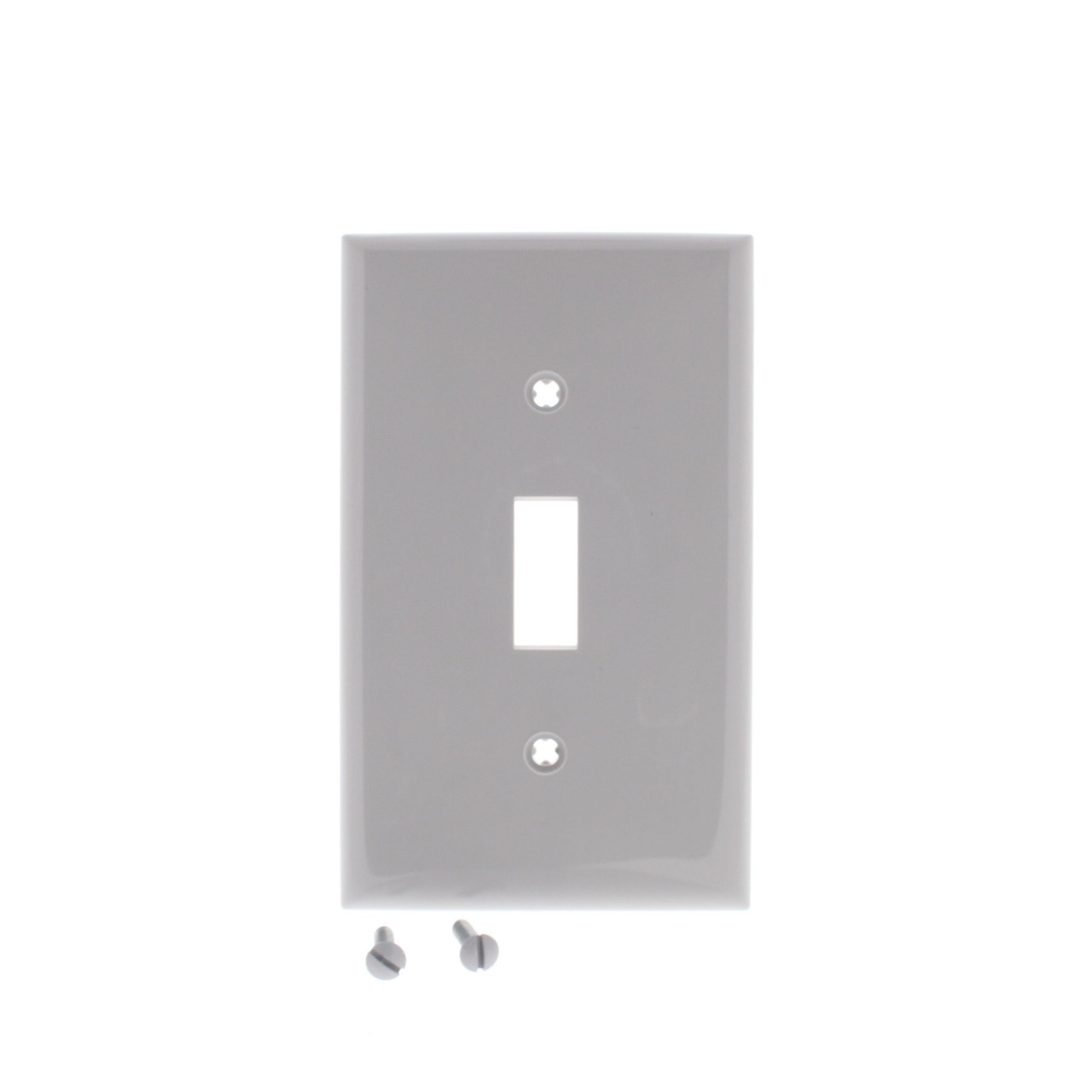 Leviton 80701-GY gray single-gang toggle switch wallplate. Made of a tough, high-performance, unbreakable thermoplastic, designed for more demanding locations such as commercial installations - do not confuse them with regular Residential Grade wallplates which can chip or crack. Commercial Specification Grade, standard size plates, measuring 4.5"h x 2.75"w. Each is individually packaged with matching mounting screws.