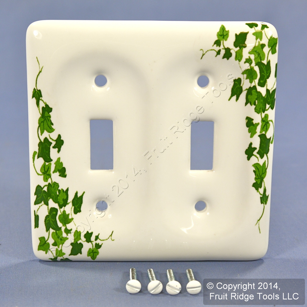 Leviton 89509-GRN white porcelain switch cover decorated with a green vine pattern. Residential Grade, standard size 2-gang wallplates measuring 4.5"h x 4.56"w with two toggle switch openings. Features include:
