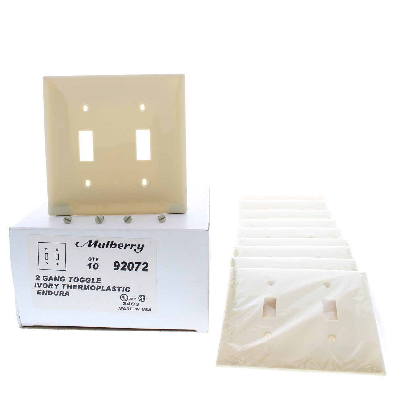 10 Mulberry 90072 white unbreakable 2-gang toggle switch wallplates. Commercial Grade, standard size, measuring 4.5"h x 4.562"w. Made of a high performance unbreakable thermoplastic material - do not confuse this with regular Residential Grade wallplates which can chip or crack. Features include: