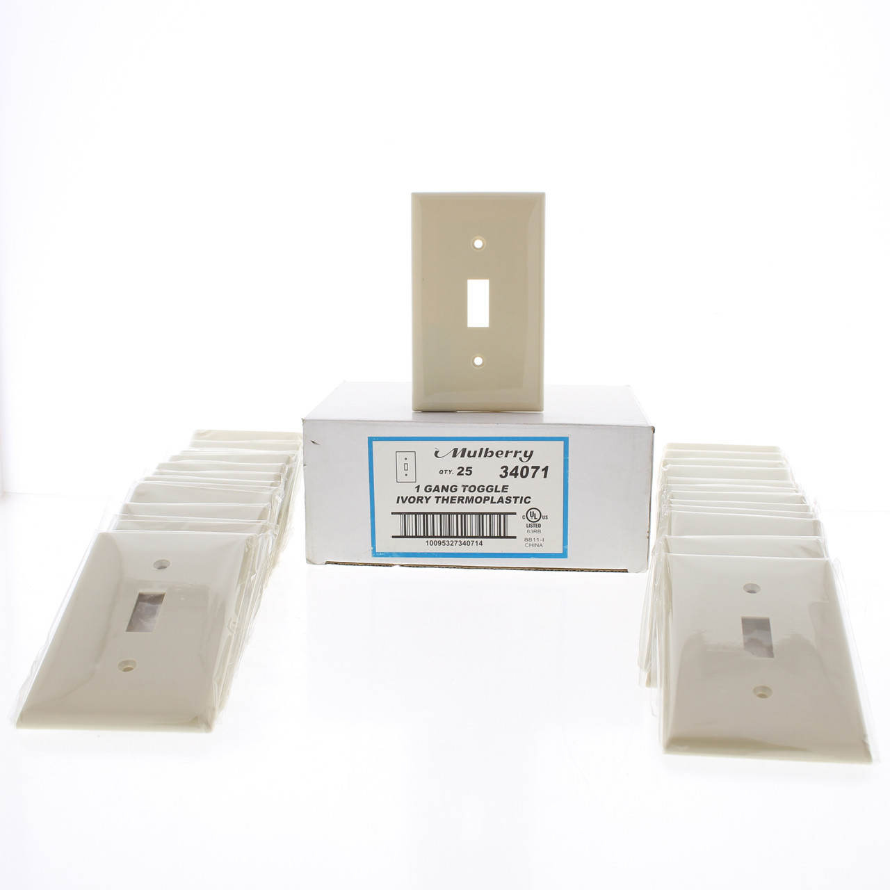 25 Mulberry 34071 ivory single-gang toggle switch cover plates. Commercial Grade, standard size, measuring 4.5"h x 2.75"w. Made of a high performance unbreakable thermoplastic material - do not confuse this with regular Residential Grade wallplates which can chip or crack. Features include: