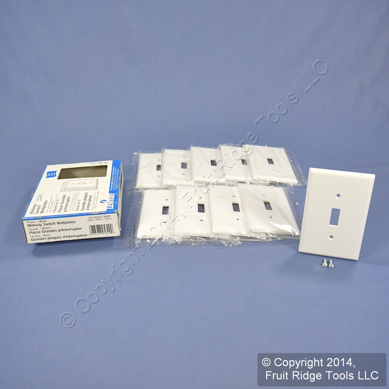 10 Leviton 80501-W white toggle switch wallplates. Residential grade, Midway size; each measures 3.125"w X 4.875"h, 3/8" larger in both dimensions than standard size plates. Intended for use with larger volume outlet boxes or to hide irregularities in the surrounding wall. Features include: