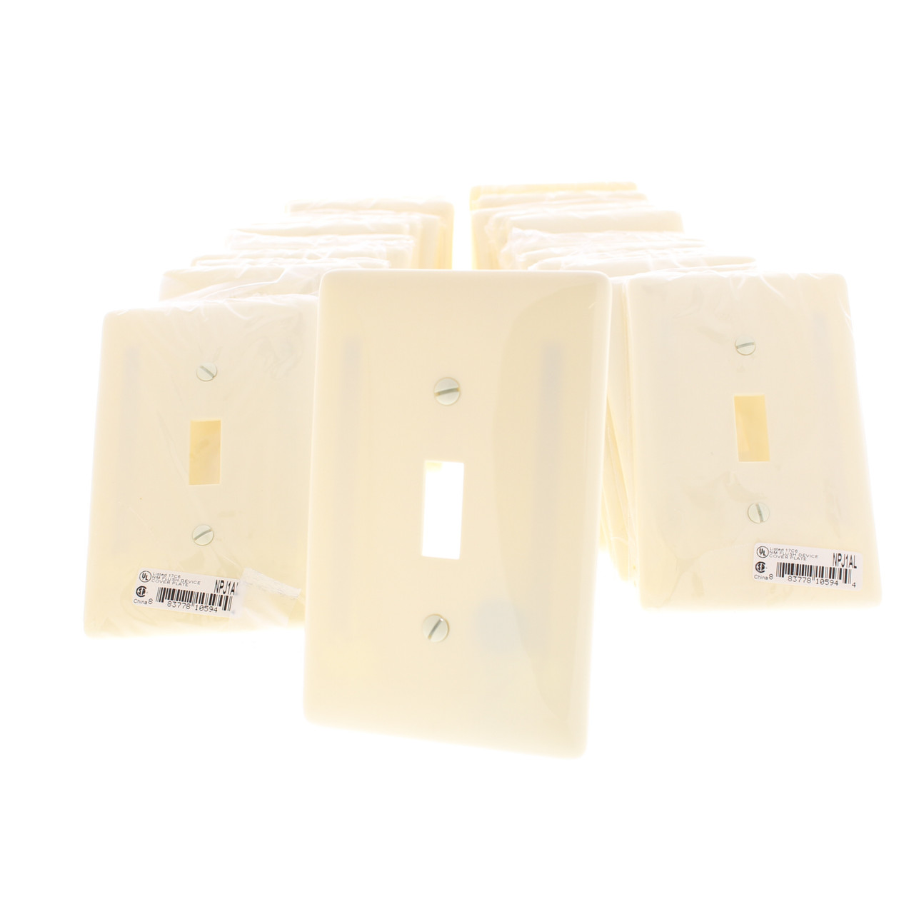 25-pack of Hubbell NPJ1AL almond unbreakable single-gang toggle switch covers. Commercial Grade, Mid-Size, measuring 4.88"h x 3.13"w, 3/8" higher and wider than standard wallplates for use with larger size wall boxes and to hide irregularities on the surrounding wall. Made of a tough unbreakable thermoplastic for use in more demanding environments such as commercial locations - do not confuse with with regular residential grade wallplates which can chip or crack. Ideal for schools, hospitals, industrial or other applications where good looks, strength and durability are required. Each is individually packaged; packaging may differ from photos. Features include: