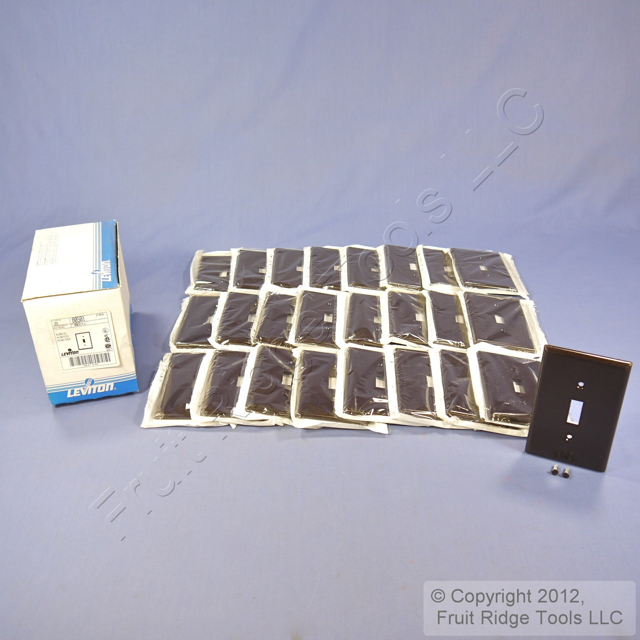 25 Leviton 80501 brown toggle switch wallplates. Residential grade, Midway size; measures 3.125"w X 4.875"h, 3/8" larger in both dimensions than standard size plates and intended for use with larger volume outlet boxes or to hide irregularities in the surrounding wall. Features include: