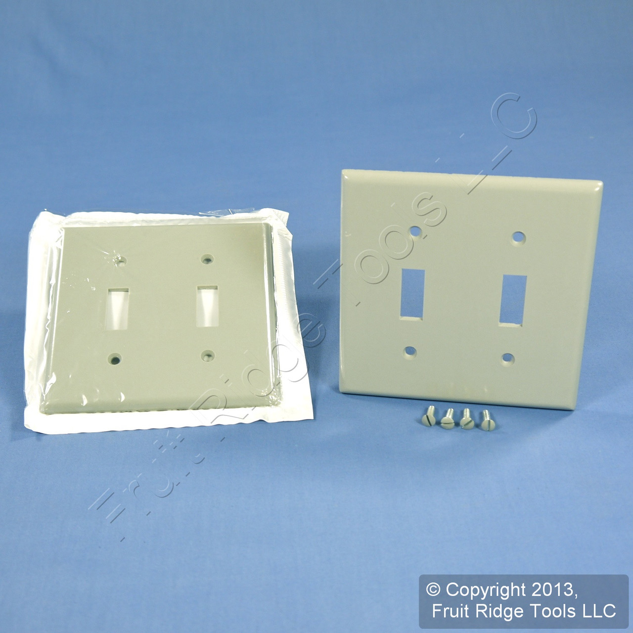 2 Leviton 87009 gray 2-gang toggle switch cover plates. Residential Grade, standard size, measuring 4.5"h x 4.56"w. Features include: