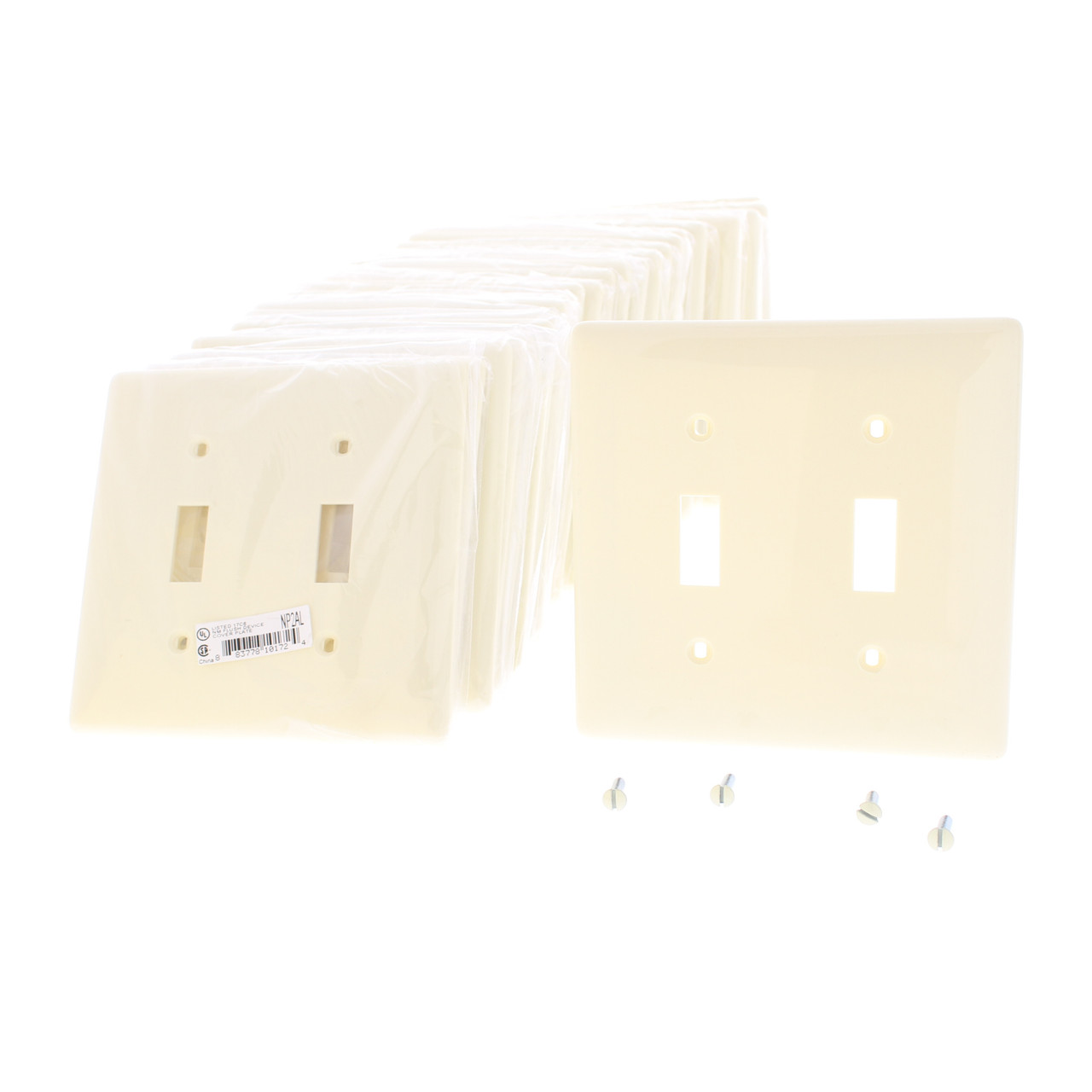 25 Hubbell NP2AL almond 2-gang toggle switch wallplates. Commercial grade cover with two toggle switch openings. Slightly oversize dimensions, measuring 4.63"h x 4.68"w, provide an extra 1/8" in length and width than standard plates from other manufacturers to provide increased coverage around irregular wall openings. Made of a tough virtually unbreakable nylon - do not confuse it with regular plastic residential plates which can chip or crack. Features include:
