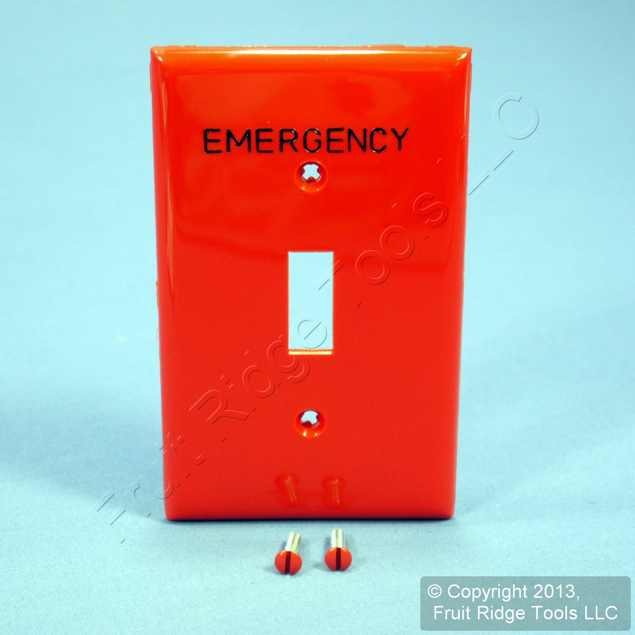 Leviton 80701-RE red single-gang toggle switch wallplate permanently hot-stamped with "EMERGENCY". Made of a tough, high-performance, unbreakable thermoplastic, designed for more demanding locations such as commercial installations - do not confuse them with regular Residential Grade wallplates which can chip or crack. Commercial Specification Grade, standard size plates, measuring 4.5"h x 2.75"w. Each is individually packaged with matching mounting screws.