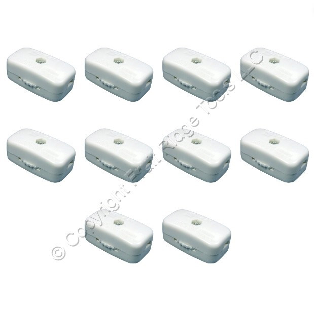 10 Leviton 423-3KW white miniature feed-through cord switches. ON/OFF sequence is controlled by rolling thumb wheel in one direction. Bulk packed loose with no individual packaging or instructions. Single pole, rated 6 Amp 125V, 3 Amp 125VT, 3 Amp 250V. For use with type SPT-1, 18 gauge cord only.