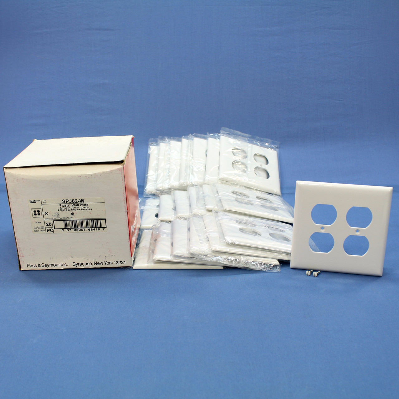 20 Pass and Seymour SPJ82-W white 2-gang duplex outlet cover plates. Residential Grade receptacle wallplate, Junior-Jumbo size, measuring 4.87"h x 4.93"w, 3/8" higher and wider than standard wallplates for use with larger size wall boxes and to hide irregularities on the surrounding wall. Each is individually packaged; packaging may differ from photos. Features include:
