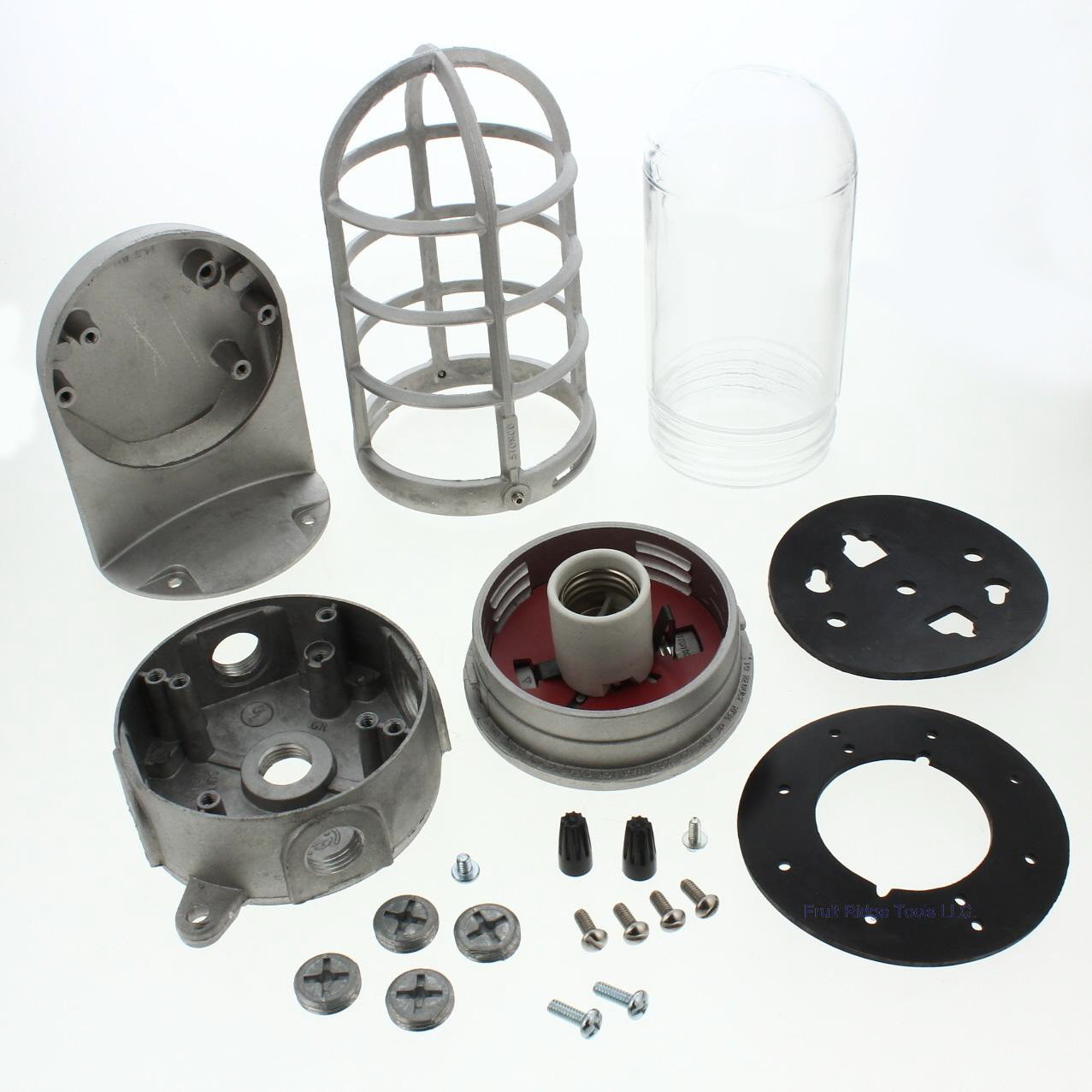 Pass and Seymour #VPW100-G ceiling mount vaporproof fixture. The fixture is weatherproof and made of cast aluminum material with a cast guard. Rated at 100 watts and features a 1/2" hub size. Each is individually packaged; packaging may differ from photo.