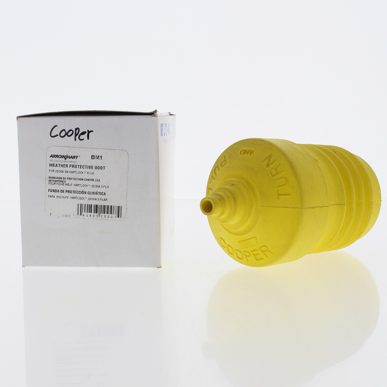 Cooper BM1 locking plug weather resistant boot in high-visibility yellow. Industrial Specification Grade Neoprene boot ONLY fits Cooper/Arrow Hart 3-wire 20 & 30 Amp locking plugs. Weather resistant design to protect against dirt and moisture. Features include: