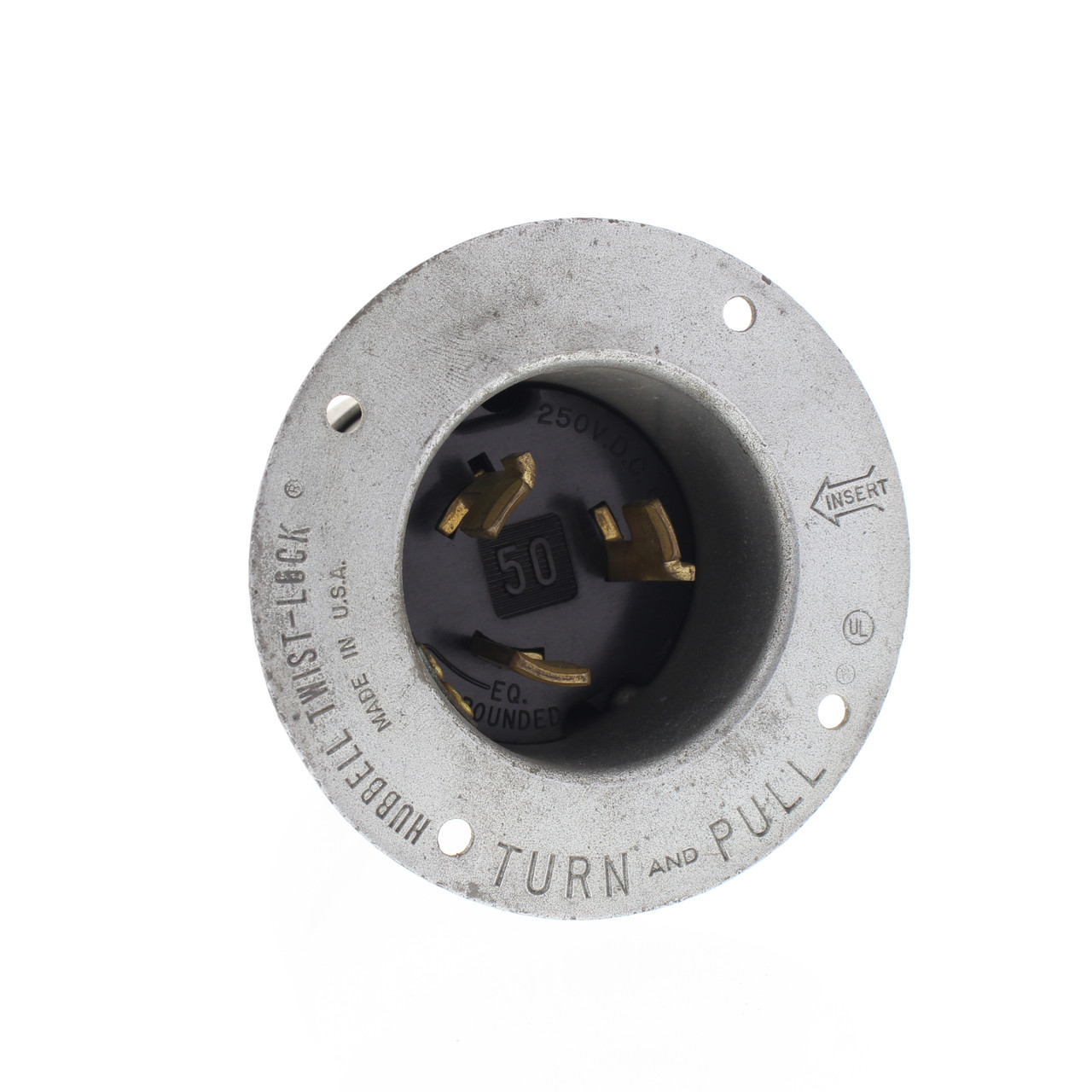 Hubbell/Bryant armored locking flanged inlet. Industrial Grade, NON-NEMA, 3-pole, 4-wire, grounding, rated 50A 250VDC/600VAC. Bulk packed loose with no individual packaging or instructions.