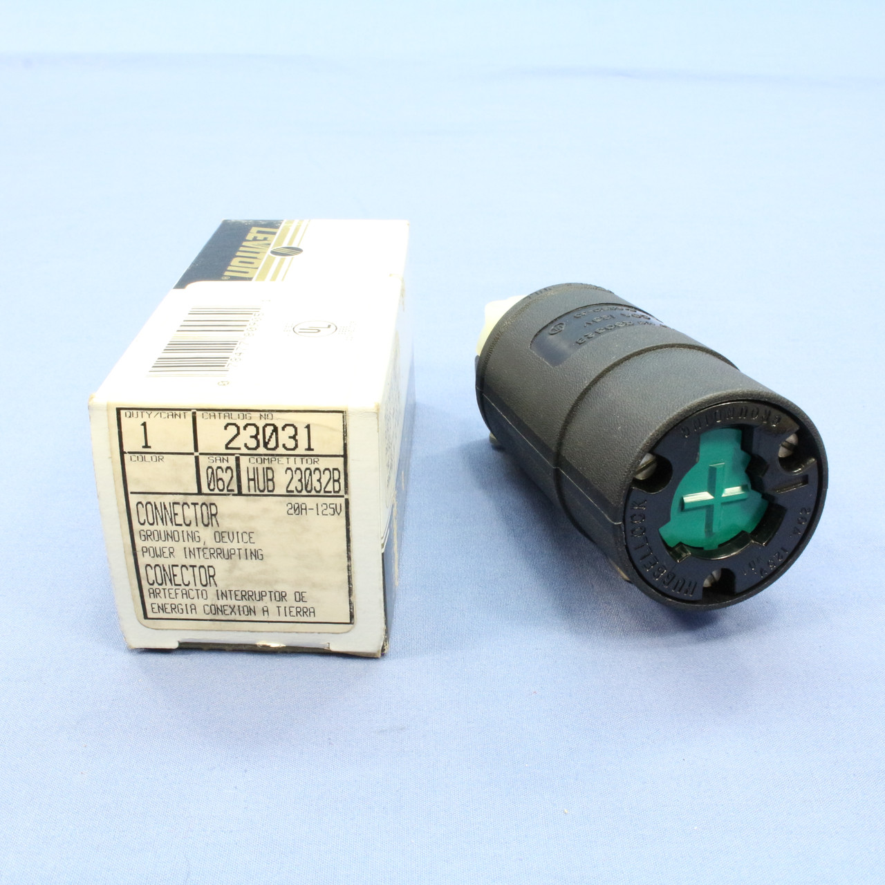 Leviton 23031 power interrupting locking connector (labelled Leviton but actually manufactured by Hubbell). Industrial Grade, non-NEMA, 2-pole, 3-wire, grounding, rated 20A 125V. Features include: