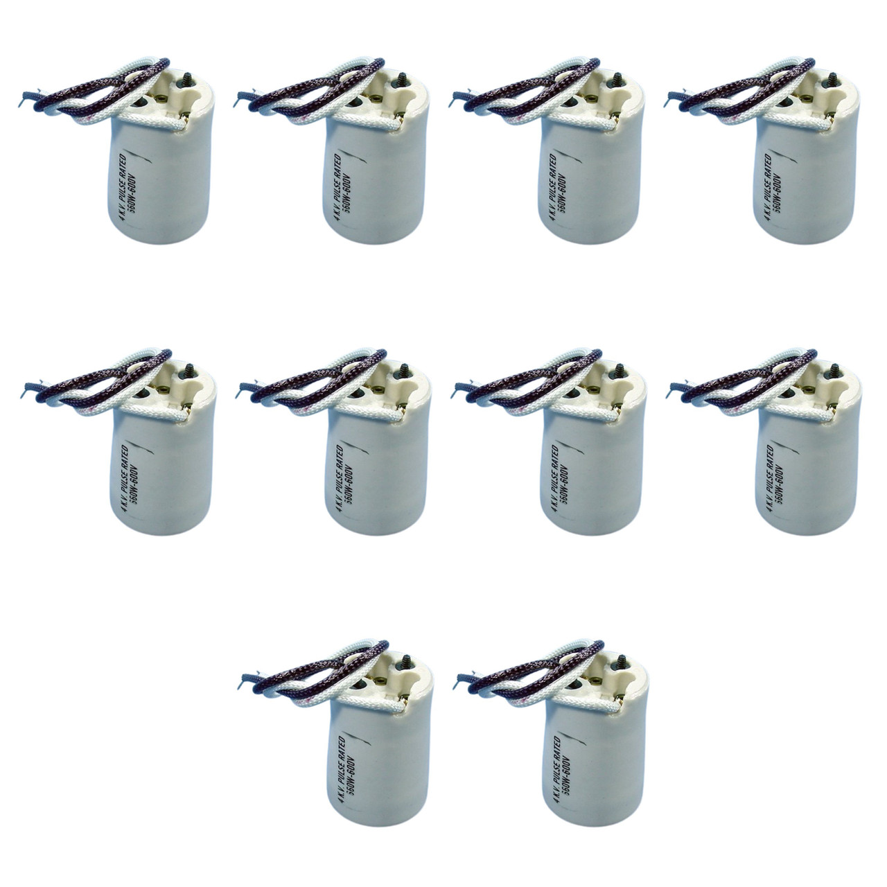 10 Leviton 70052-100 white porcelain lampholders. Pulse rated with leads for open-fixture medium base lamps, typically used in metal halide or similar industrial fixtures. Features include: