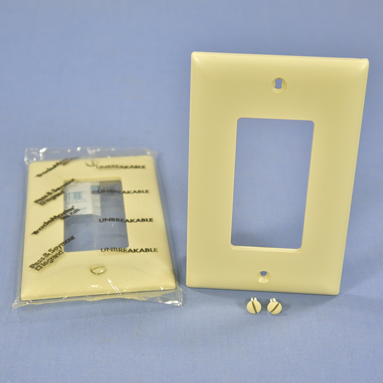 2 Pass and Seymour Trademaster TP26-I ivory decorator unbreakable wallplates with a single opening for Decorator, rocker, and GFCI devices. Trademaster Grade, Trademaster size (2.9375"h x 4.6875"w), 3/16" higher and wider than standard size plates; made of a tough unbreakable thermoplastic - do not confuse them with regular Residential grade plates that can chip and crack. Features include: