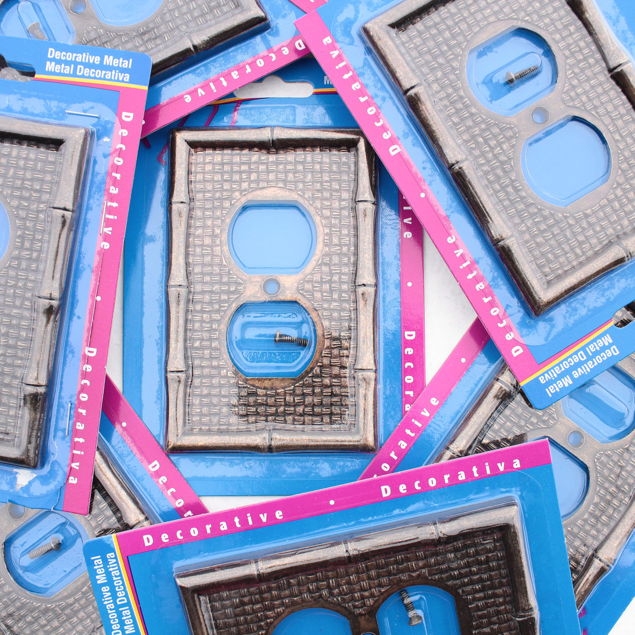 10 Leviton 89603 cast metal wallplates with antique brass finish; tiki theme with woven background and bamboo border. Residential Grade, Midway size single-gang plate measuring 4-7/8"h x 3-1/8"w, 3/8" larger in both dimensions than standard size plates and intended for use with larger volume outlet boxes or to hide irregularities in the surrounding wall. Features include: