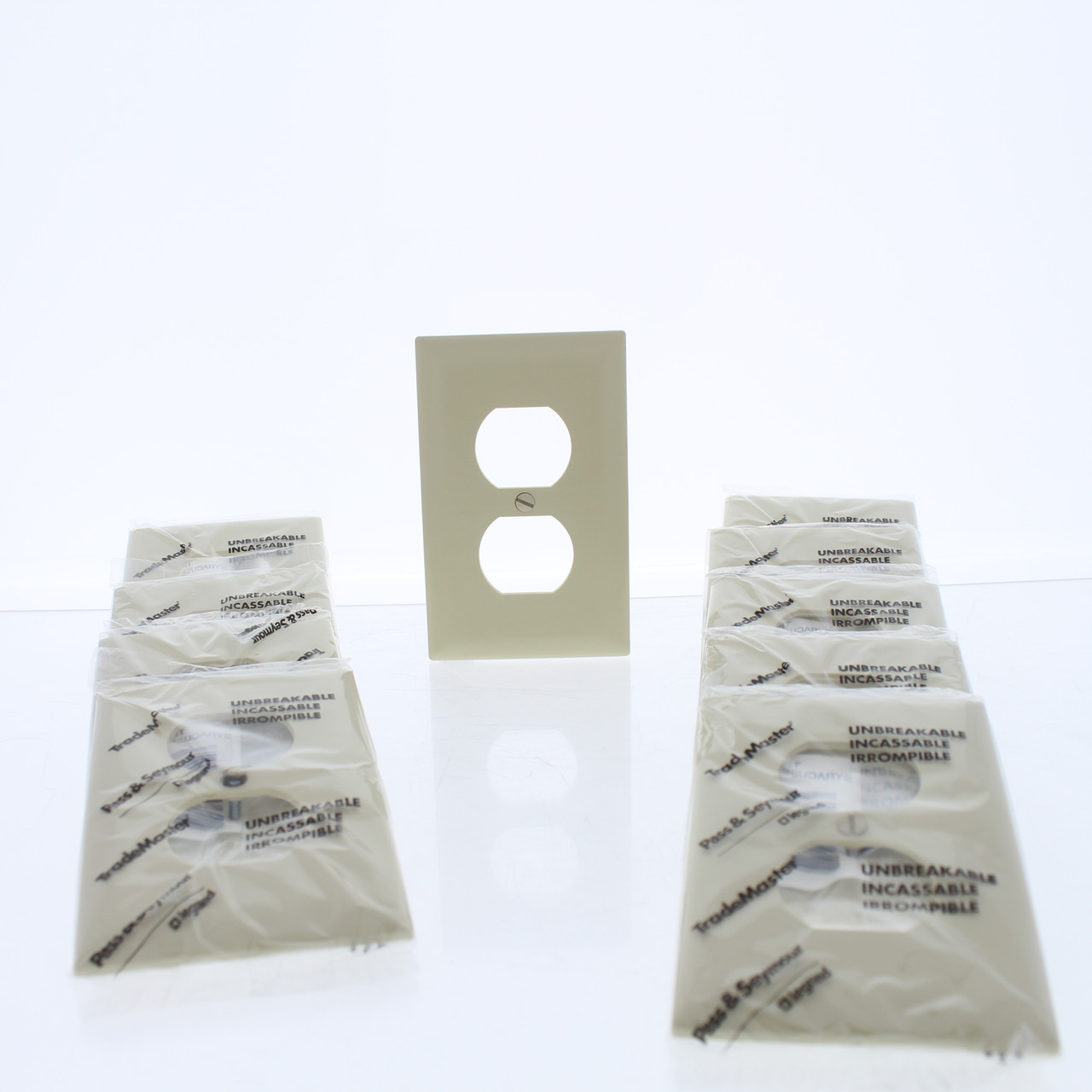 10 Pass & Seymour TP8-ICP ivory duplex receptacle wallplates. Trademaster size, measuring 2.9375"w x 4.6875"h, 3/16" higher and wider than standard size plates to cover large box openings and hide wall irregularities. Made of nylon to be virtually unbreakable - designed to stand up to the heavy abuse of commercial environments. Do not confuse them with regular Residential grade plates that can chip and crack. Each is individually packaged; packaging may differ from photos. Features include: