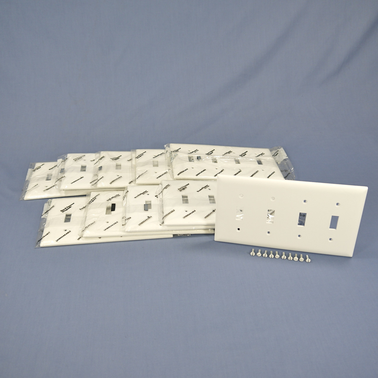 10 Pass and Seymour Trademaster® TP4-W white 4-gang nylon switch wallplates with four toggle switch openings. Trademaster Grade, Trademaster size plate measuring 4.6875"h x 8.375"w, 3/16" taller and wider than a standard size plate. Made of nylon to be virtually unbreakable - designed to stand up to the heavy abuse of commercial environments. Features include: