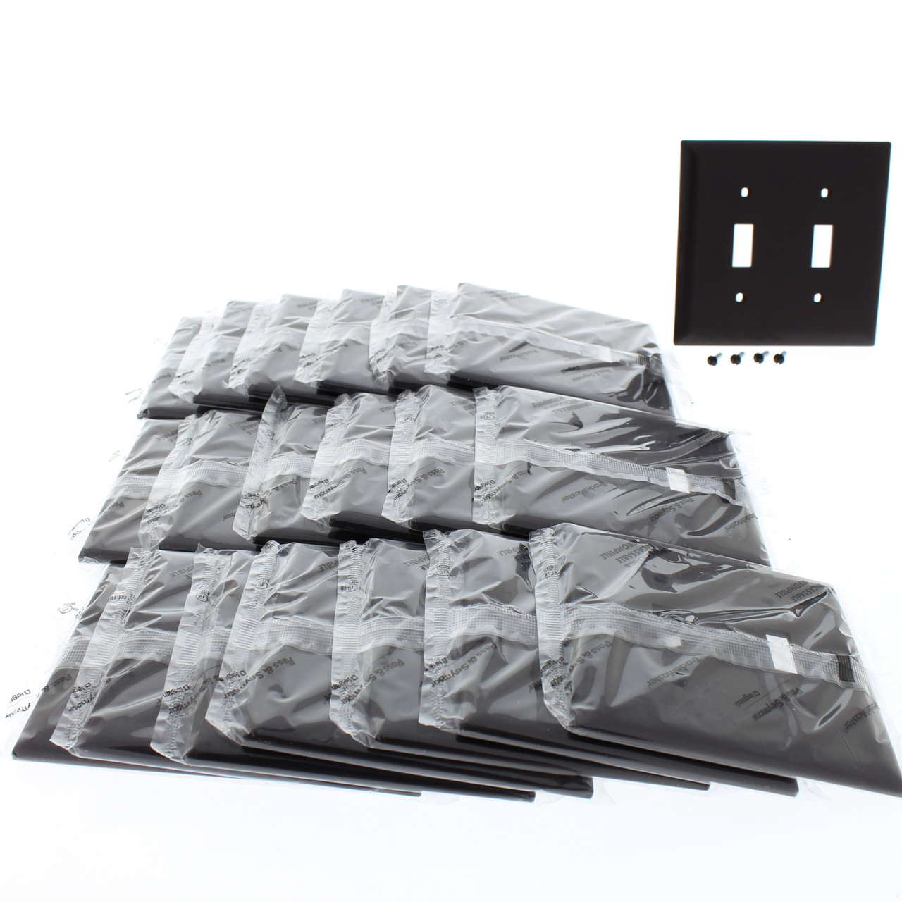 20 Pass and Seymour Trademaster TP2 brown 2-gang toggle switch nylon wallplates. Trademaster size, measuring 2.9375"w x 4.6875"h, 3/16" higher and wider than standard size plates to cover large box openings and hide wall irregularities. Made of nylon to be virtually unbreakable - designed to stand up to the heavy abuse of commercial environments. Each is individually packaged; packaging may differ from photos. Features include: