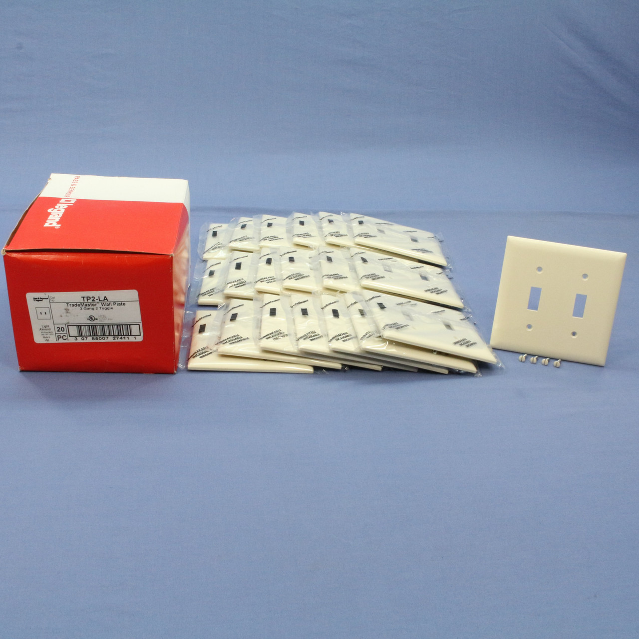 20 Pass and Seymour Trademaster TP2-LA light almond 2-gang toggle switch nylon wallplates with 2 switch openings. Trademaster Grade, Trademaster size measuring 4.6875"H x 4.75"W, 3/16" higher and wider than standard size plates; made of a tough unbreakable thermoplastic - do not confuse them with regular Residential grade plates that can chip and crack. Made of nylon to be virtually unbreakable - designed to stand up to the heavy abuse of commercial environments. Each is individually packaged; packaging may differ from photos. . Made of nylon to be virtually unbreakable - designed to stand up to the heavy abuse of commercial environments. Each is individually packaged; packaging may differ from photos. Features include: