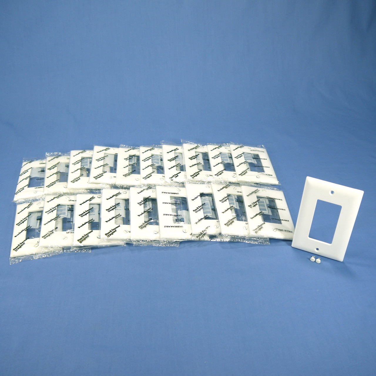 20-Pack Pass and Seymour Trademaster TP26-W white decorator unbreakable wallplates with a single opening for Decorator, rocker, and GFCI devices. Trademaster Grade, Trademaster size (2.9375"h x 4.6875"w), 3/16" higher and wider than standard size plates; made of a tough unbreakable thermoplastic - do not confuse them with regular Residential grade plates that can chip and crack. Features include: