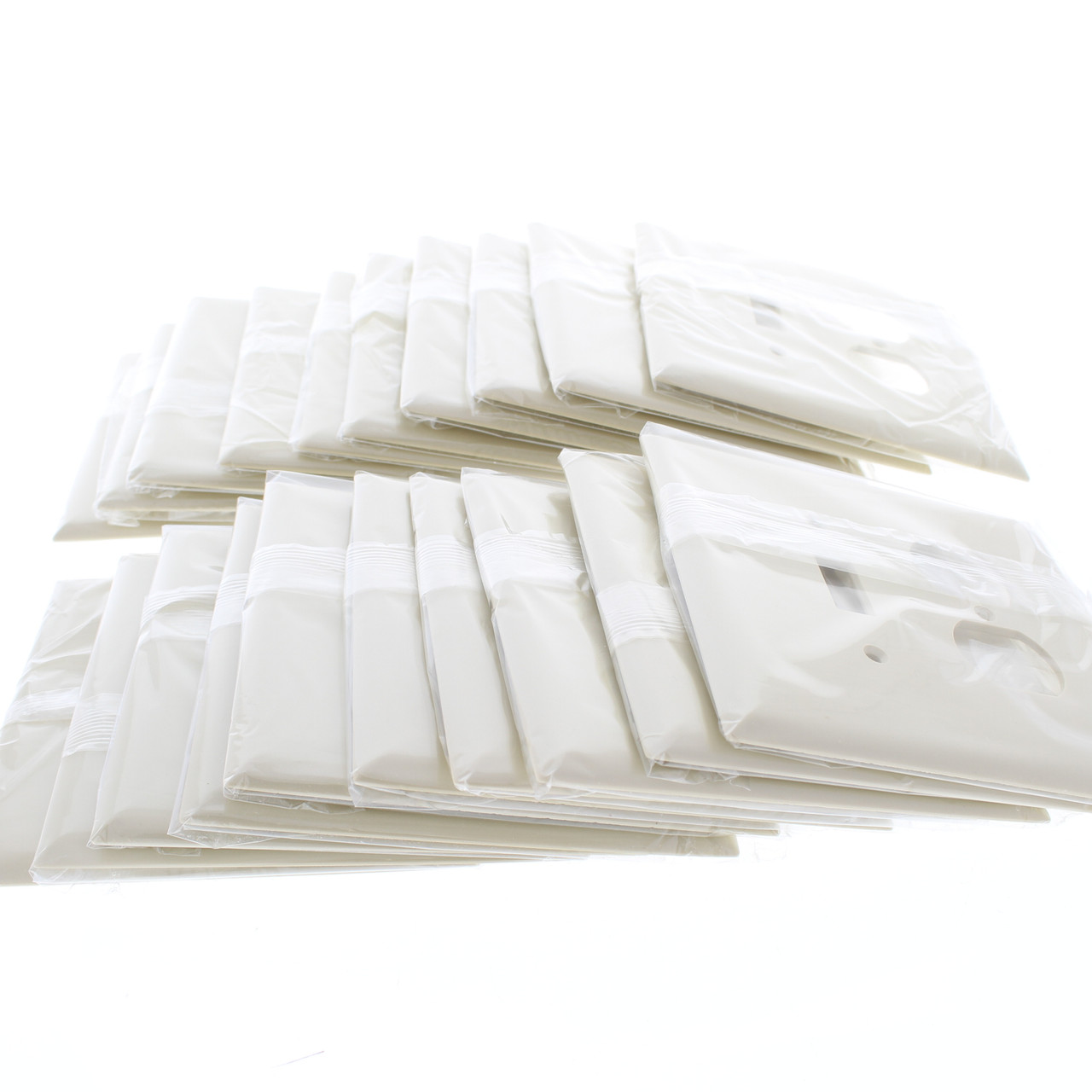 20 Pass and Seymour SPO18-I ivory wallplates. Oversize 2-gang dimensions, measuring 5.25"h x 5.31"w, 3/4" higher and wider than standard wallplates to provide maximum coverage of wall irregularities. Residential Grade with one toggle switch opening and one duplex outlet opening. Each is individually packaged; packaging may differ from photos. Features include: