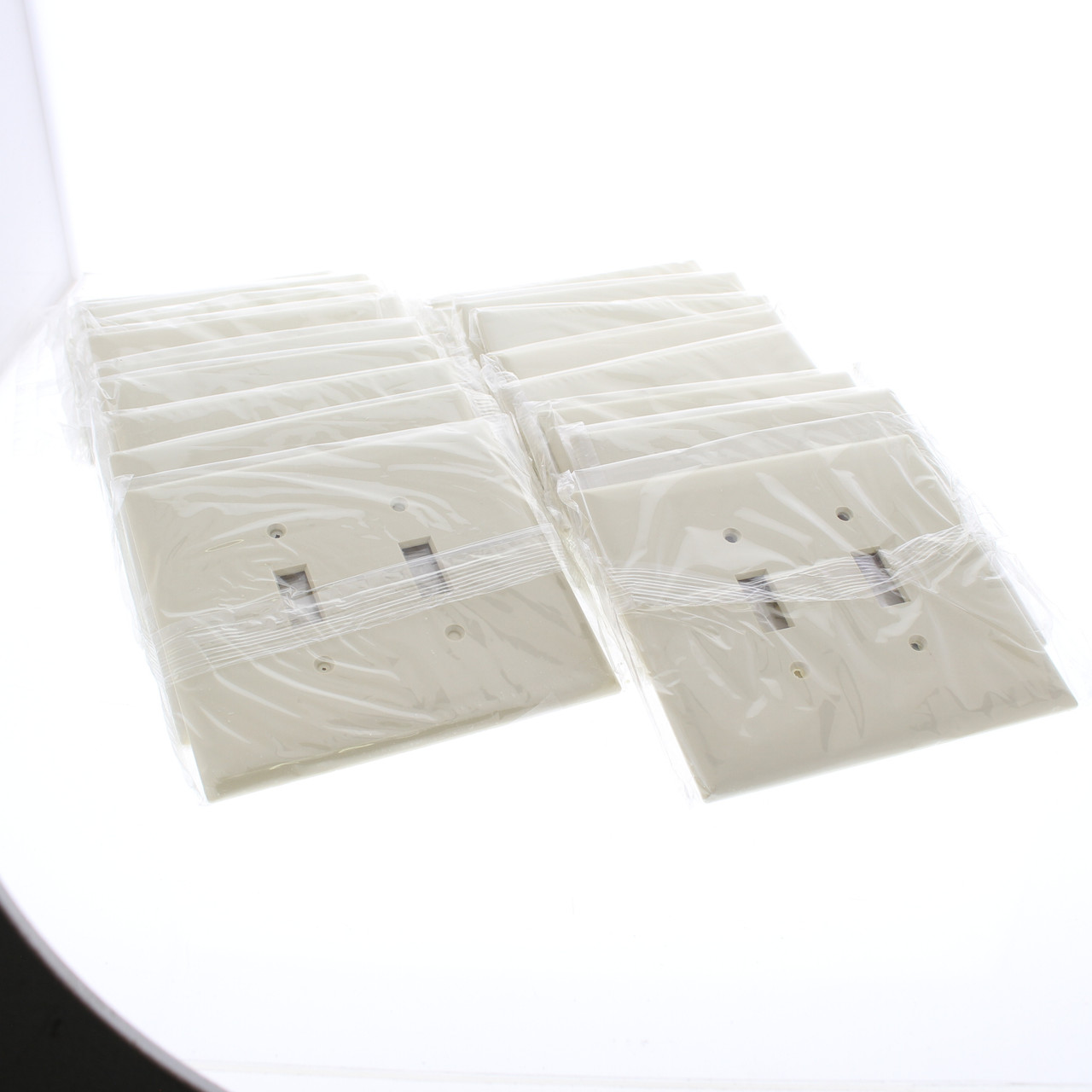 20 Pass and Seymour SPO2-I ivory 2-gang toggle switch plastic cover plates. Residential Grade receptacle wallplate, Jumbo size, measuring 5.25"h x 5.31"w, 3/4" higher and wider than standard wallplates for use with larger size wall boxes and to hide irregularities on the surrounding wall. Each is individually packaged; packaging may differ from photos. Features include: