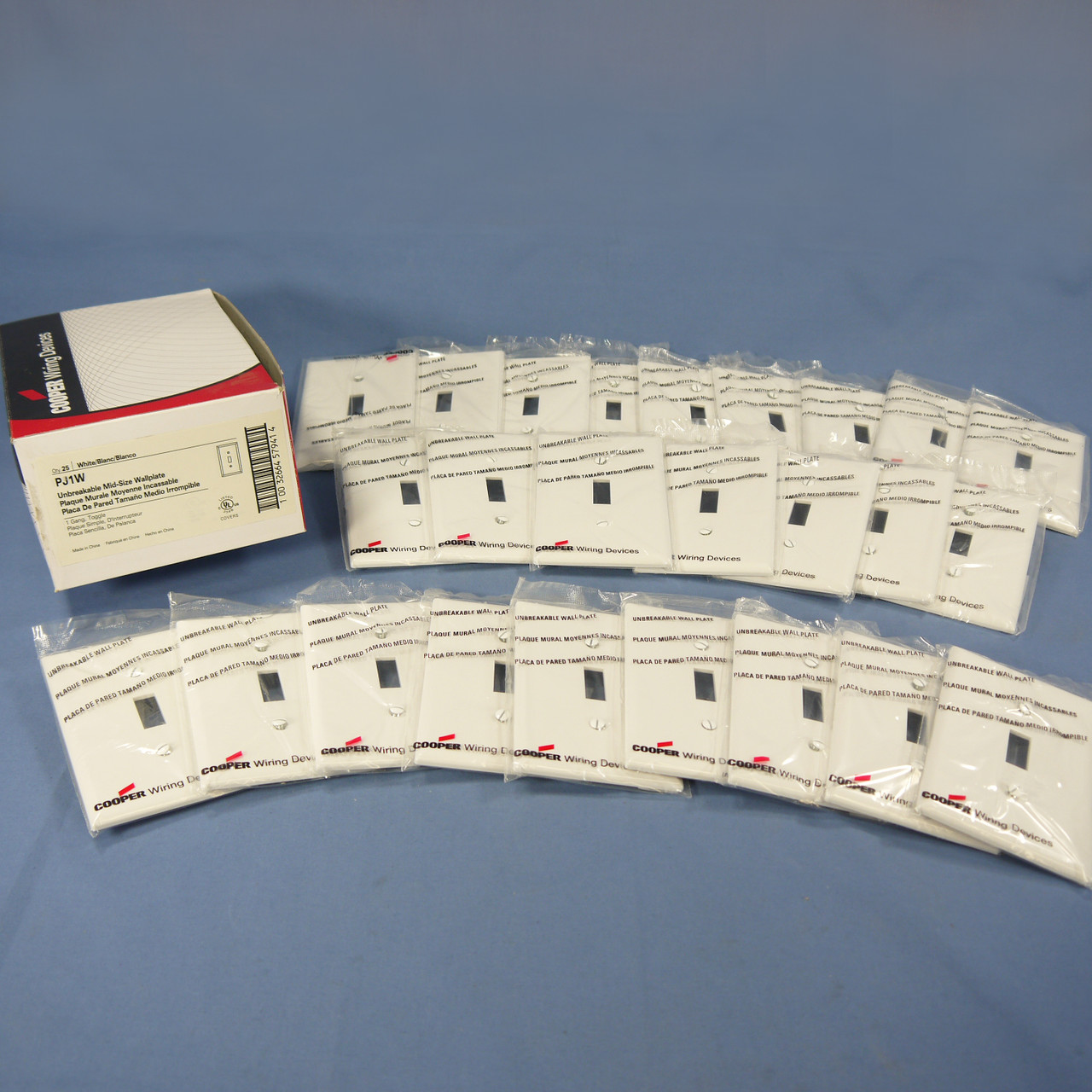 25 Cooper PJ1W white unbreakable switch cover wallplates. Commercial Specification Grade, Mid-Size, made of a high-performance unbreakable thermoplastic for high abuse environments; do not confuse it with regular residential grade wallplates which can chip and crack. Mid-Size size measures 3.125"w X 4.875"h, 3/8" larger in both dimensions than standard size plates and is intended for use with larger volume outlet boxes or to hide irregularities in the surrounding wall. Features include: