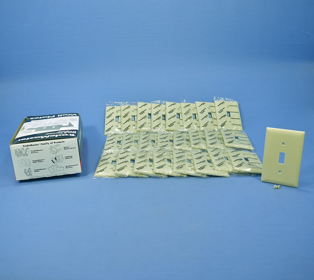 25 Pass & Seymour TP1-I ivory toggle switch wallplates. Trademaster size, measuring 2.9375"w x 4.6875"h, 3/16" higher and wider than standard size plates to cover large box openings and hide wall irregularities. Made of nylon to be virtually unbreakable - designed to stand up to the heavy abuse of commercial environments. Features include: