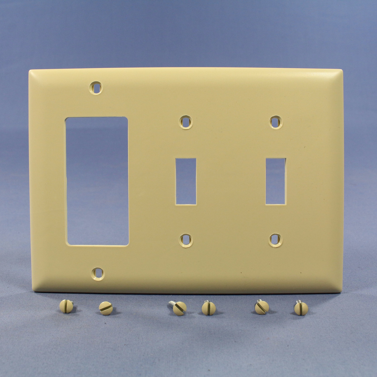 Pass and Seymour TP226-I ivory 3-gang Trademaster thermoplastic wallplate. Trademaster plate (measuring 6.563"h x 4.6875"w) with two toggle and one decorator/GFCI openings. Features include: