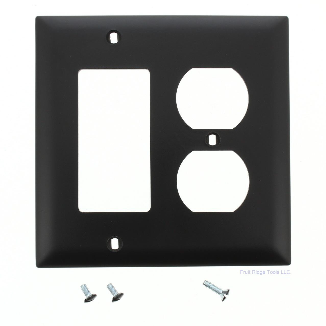 Pass and Seymour Trademaster TP826-BK black 2-gang combination duplex outlet and Decorator/GFCI/rocker cover. TradeMaster Grade, made of a high-performance unbreakable thermoplastic for high abuse environments; do not confuse it with regular residential grade wallplates which can chip and crack. Trademaster size measuring 4.6875"H x 4.75"W, 3/16" larger in both dimensions than standard size plates for use with larger volume outlet boxes or to hide irregularities in the surrounding wall. Each wallplate has duplex outlet opening and one rectangular opening which is compatible with standard GFCI and Decorator type devices. Features include:
