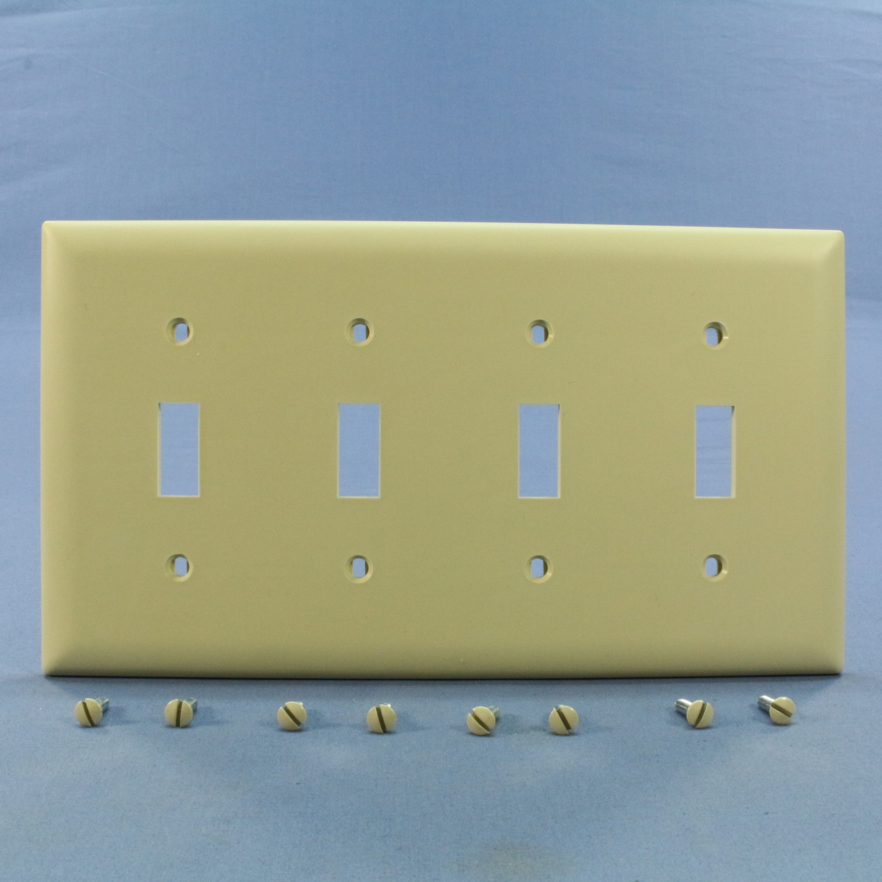 Pass and Seymour Trademaster TP4-I ivory 4-gang nylon switch wallplate with four toggle switch openings. Trademaster Grade, Trademaster size plate measuring 4.6875"h x 8.375"w, 3/16" taller and wider than a standard size plate. Made of nylon to be virtually unbreakable - designed to stand up to the heavy abuse of commercial environments. Features include: