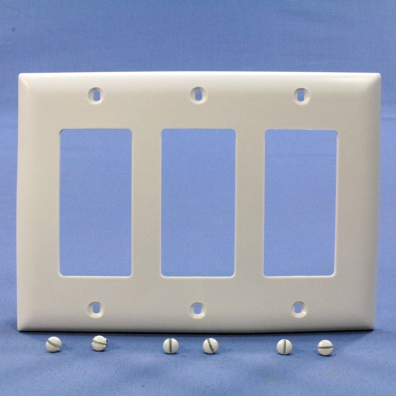 Pass & Seymour TP263-W white 3-gang Decorator wallplate with rectangular openings that are compatible with Decorator, rocker, and GFCI devices. Trademaster Grade, Trademaster size measuring 4.6875"H x 6.563"W, 3/16" higher and wider than standard size plates; made of a tough unbreakable thermoplastic - do not confuse them with regular Residential grade plates that can chip and crack. Features include:
