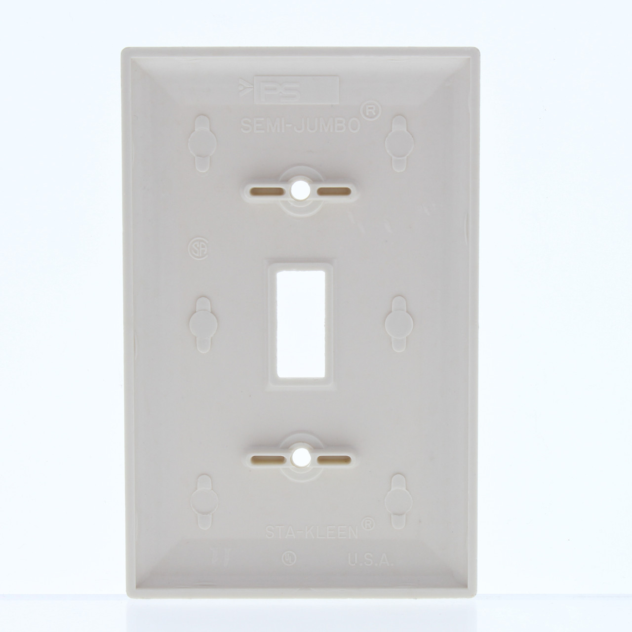 Pass and Seymour SPJ1-LA light almond 1-gang toggle switch wallplate. Commercial Specification Grade, Junior-Jumbo, measuring 4.87"h x 3.125 "w, 3/8" higher and wider than standard wallplates for use with larger size wall boxes and to hide irregularities on the surrounding wall. Each is individually packaged; packaging may differ from photos. Features include: