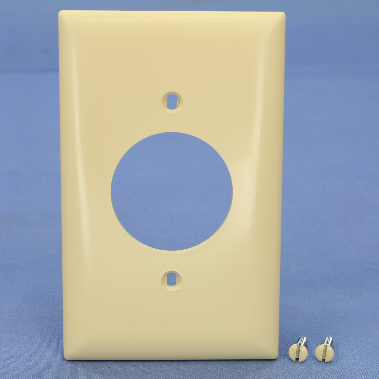 Pass and Seymour Trademaster TP720-I ivory locking outlet wallplate. Trademaster size measuring 2.9375"w x 4.6875"h, 3/16" higher and wider than standard size plates; made of a tough unbreakable thermoplastic - do not confuse them with regular Residential grade plates that can chip and crack. Single-gang outlet cover has a 1.5938" hole opening for 1.5625" diameter devices. Each is individually packaged; packaging may differ from photos. Features include: