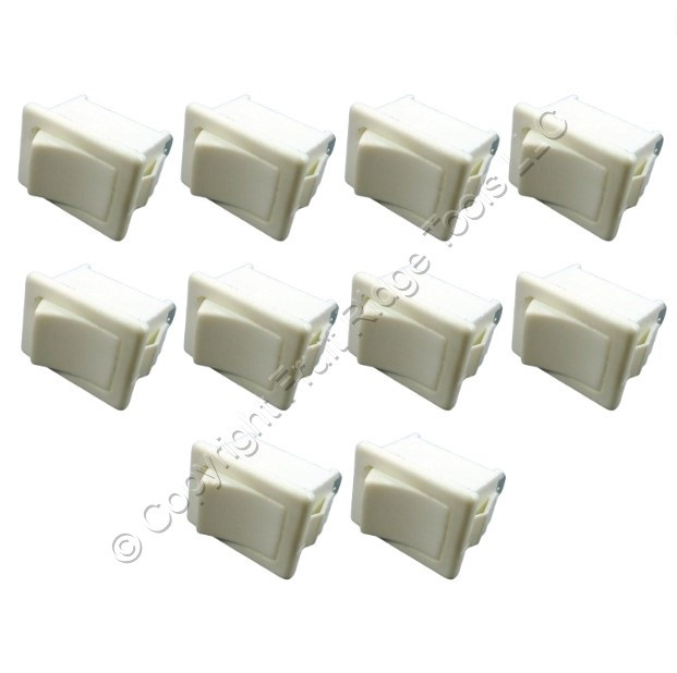 10 Leviton MR003 white mini rocker switches. Snap-in design fits in a standard 3/4" x 1/2" panel opening. Single pole, double throw, rated 10A 125V. Connection terminal spades are approximately 3/16" wide.