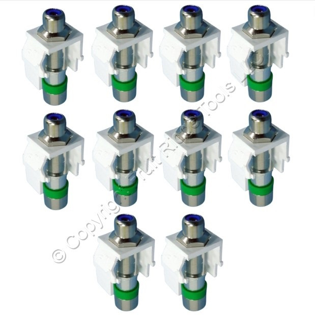 10 Leviton 40782-RLW white Quickport compression RCA connector jacks with a blue inner barrel. Special radial compression design assures more secure termination than traditional hex crimp connectors. Each is individually packaged. Features include: