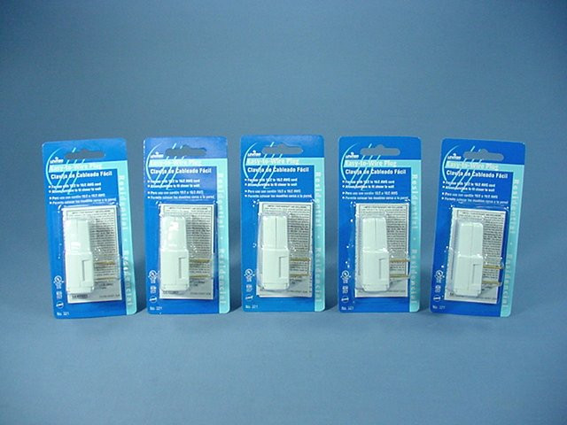 5 Leviton 321-W white easy-wire straight blade plugs. Right angle design with side cord entry keeps cord close to the wall and directs the cord sideways from the outlet (instead of up or down). Easy wire design makes for fast hookup. Residential Grade, NEMA 1-15P, non-grounding, rated 15A 125V. Plug blades are Non-polarized; do not use in an application which requires a polarized plug. Wire rating: