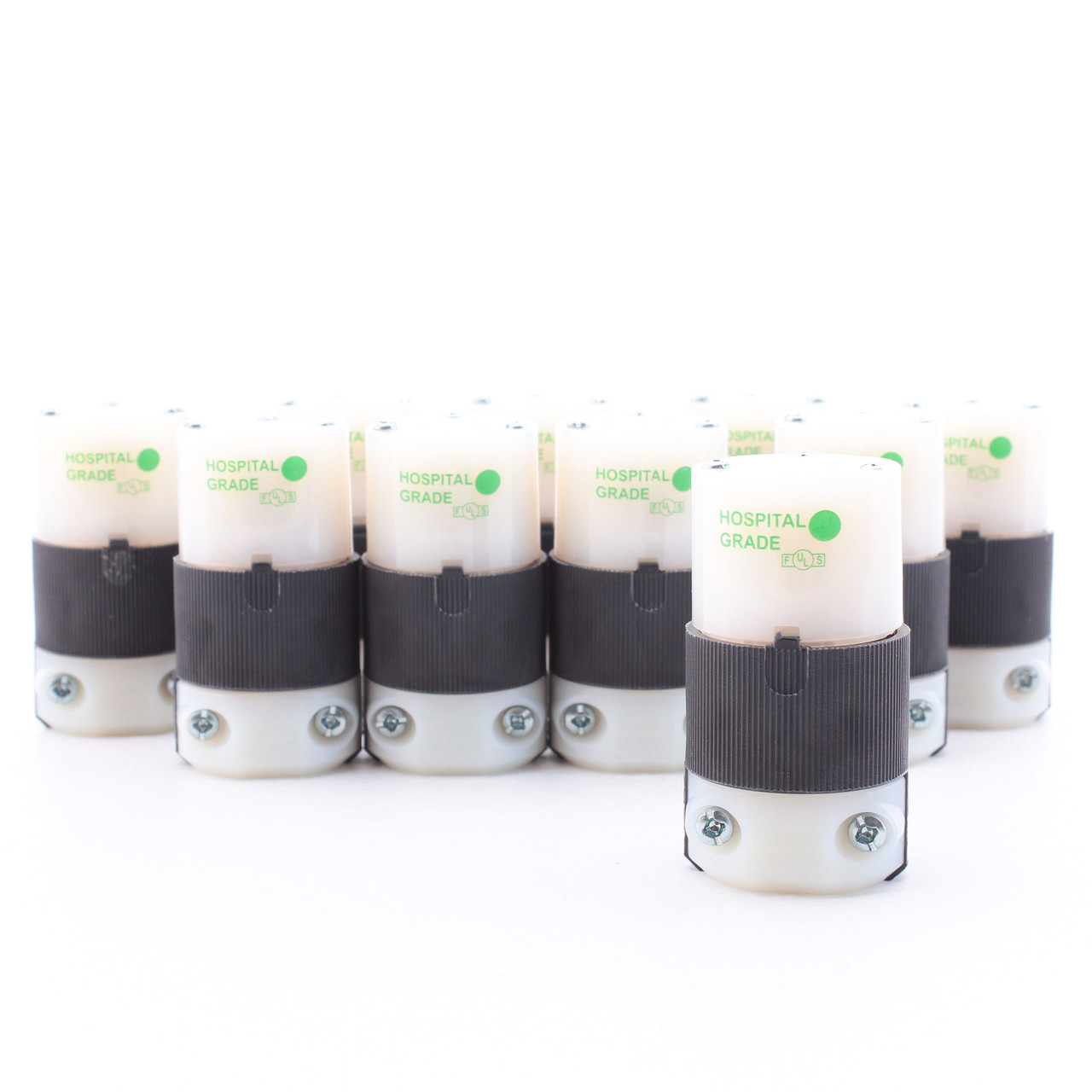 10-pack of Hubbell HBL8219C hospital grade straight-blade connectors ideal for medical and critical-care environments. Rated 15A at 125V with a NEMA 5-15R configuration, it features a durable nylon body and secure cord grip to withstand repeated use on portable medical equipment. Each is individually packaged; packaging may differ from photo. Features include:
