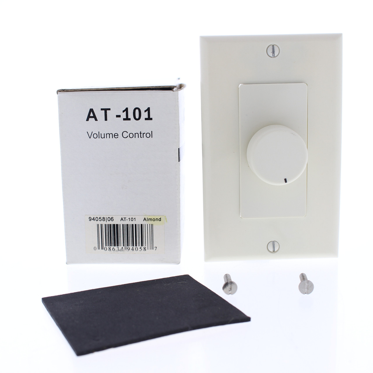 Jamo AT-101 almond rotary-type button volume control housed in a decorator plate. Frequency Response of 35 - 2000Hz. It has 12 positions with the lowest position as off. The AT-101 is a popular choice wherever users would prefer to have the volume control in one area, with the source in a different place. The AT-101 has a number of jumper settings for different impedance and for the number of connected speakers. It can handle up to 64 pairs of speakers when impedance matching instructions are followed. To maintain an optimum volume level, Jamo does not recommend connecting more than 16 pairs on a single switch.