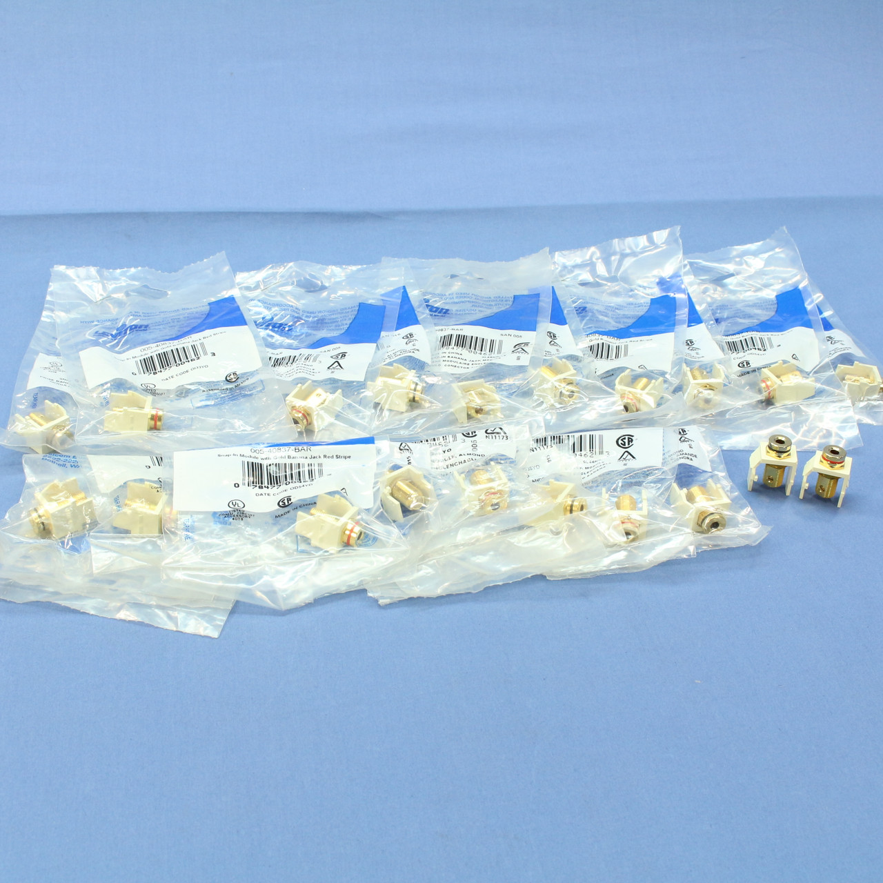 This is?10 PAIRS of Leviton #40837-A Quickport, almond, Quickport banana jacks. They are gold plated with?one?red striped and one black striped jack. They are for use with Quickport wallplates and?standard banana jack speaker plugs.
