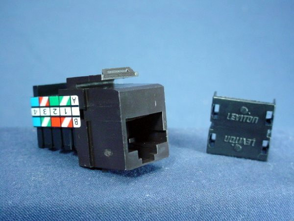 - 8-conductor keyed jack with dual color coded labels for both T568A and T568B wiring patterns